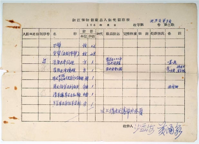浙江博物馆藏品入馆凭证存根