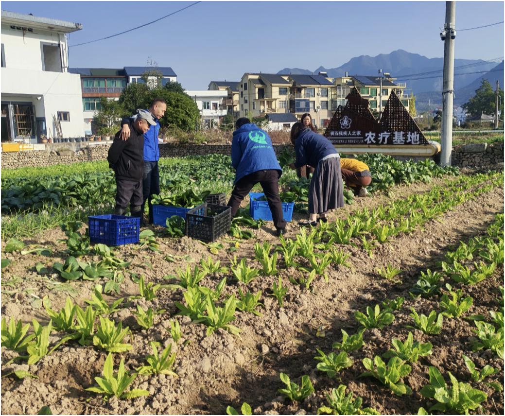 14点30分,在距离峡口镇枫石村残疾人之家仅300米的农疗基地里,残疾人小柴与同伴正忙着把丰收的青菜打包进塑料框。前几日,他们刚向峡口镇新农贸市场卖出青菜和芋艿,到账1800余元,这笔钱将用于改善大家的日常饮食。这片面积为1亩的菜园,由枫石村村委会免费提供,开垦出24垄土地,专门种植当季蔬菜,不仅让残疾人吃上了绿色有机蔬菜,更让他们在劳动中收获了康复的快乐与丰收的喜悦。为更好地管理这片菜园,峡口镇残联在菜地一侧安装了智能监控设备,可实时观察蔬菜的生长情况,进一步提升菜园利用效率,保障菜地有好收成。