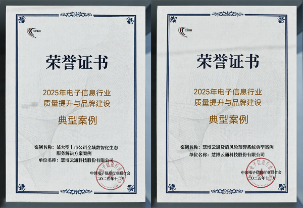 凭借扎实的技术服务与客户需求的深度响应能力,慧博云通“某大型上市公司全域数智化生态服务解决方案案例”、“慧博云通贷后风险预警系统典型案例”两项实践成果脱颖而出,成功入选为“2025年电子信息行业质量提升与品牌建设典型案例”。两大案例同时入选,充分体现了权威机构对慧博云通在质量创新、技术落地与品牌建设方面的高度认可,同时也印证了公司优质技术服务能力和产品与解决方案在市场中强劲的竞争力与客户价值导向。