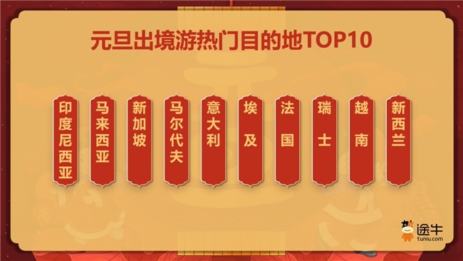 此外,印度尼西亚、马来西亚、新加坡、马尔代夫、意大利、埃及、法国、瑞士、越南、新西兰等目的地也是途牛用户元旦出境游的热门选择。(供稿人:周长润)