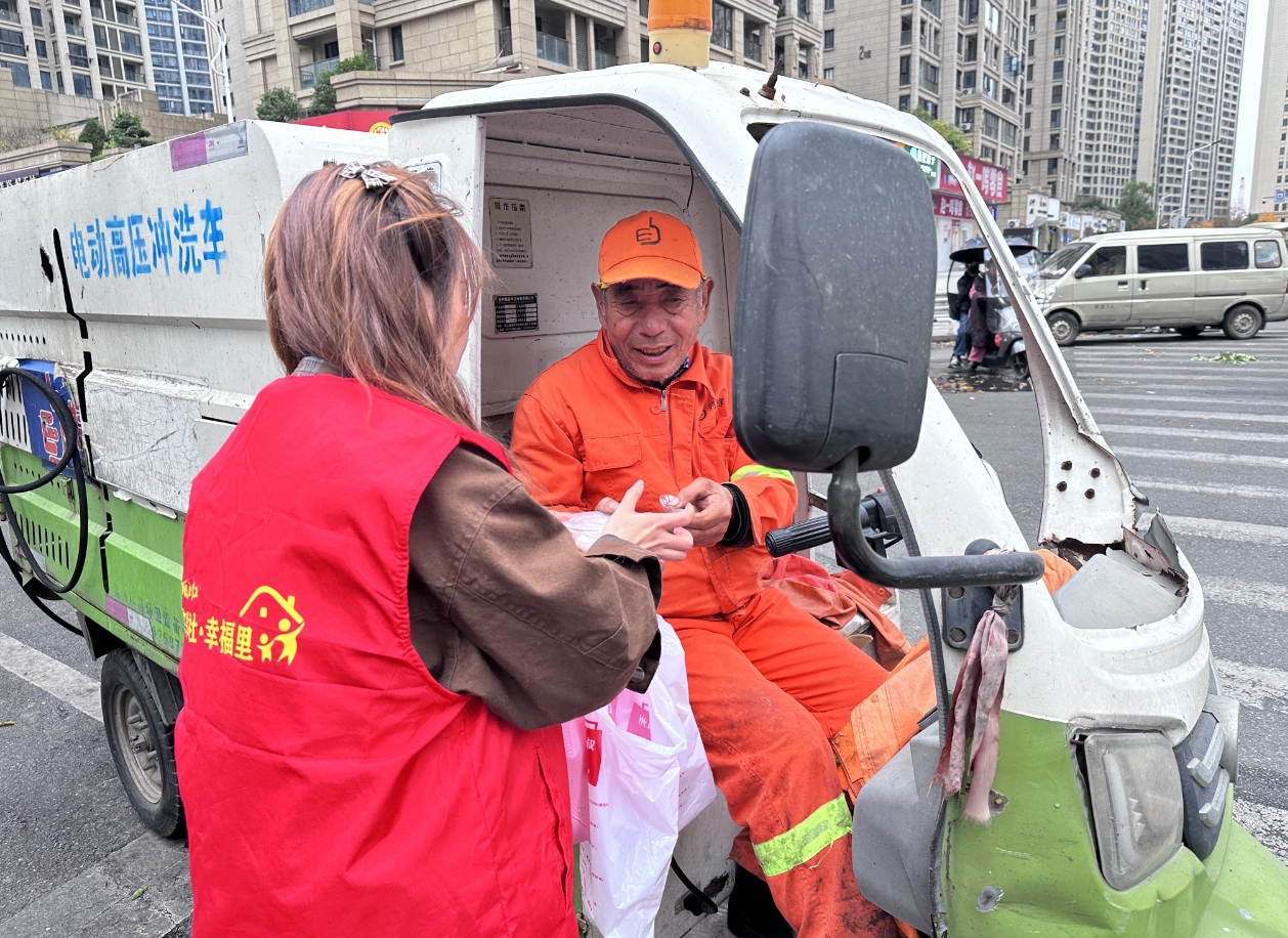 此外,志愿者们还带着汤圆走上街头,将这份温暖传递给坚守在岗位上的新就业群体。他们为寒风中忙碌的环卫工人、争分夺秒奔波的外卖骑手、穿梭不停派送包裹的快递小哥送上热气腾腾的汤圆,在送上美味的同时,不忘叮嘱大家注意防寒保暖,感谢他们为城市正常运转所付出的辛勤汗水。