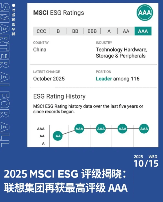 明晟MSCI发布2025年度企业ESG评级,联想集团获AAA评级