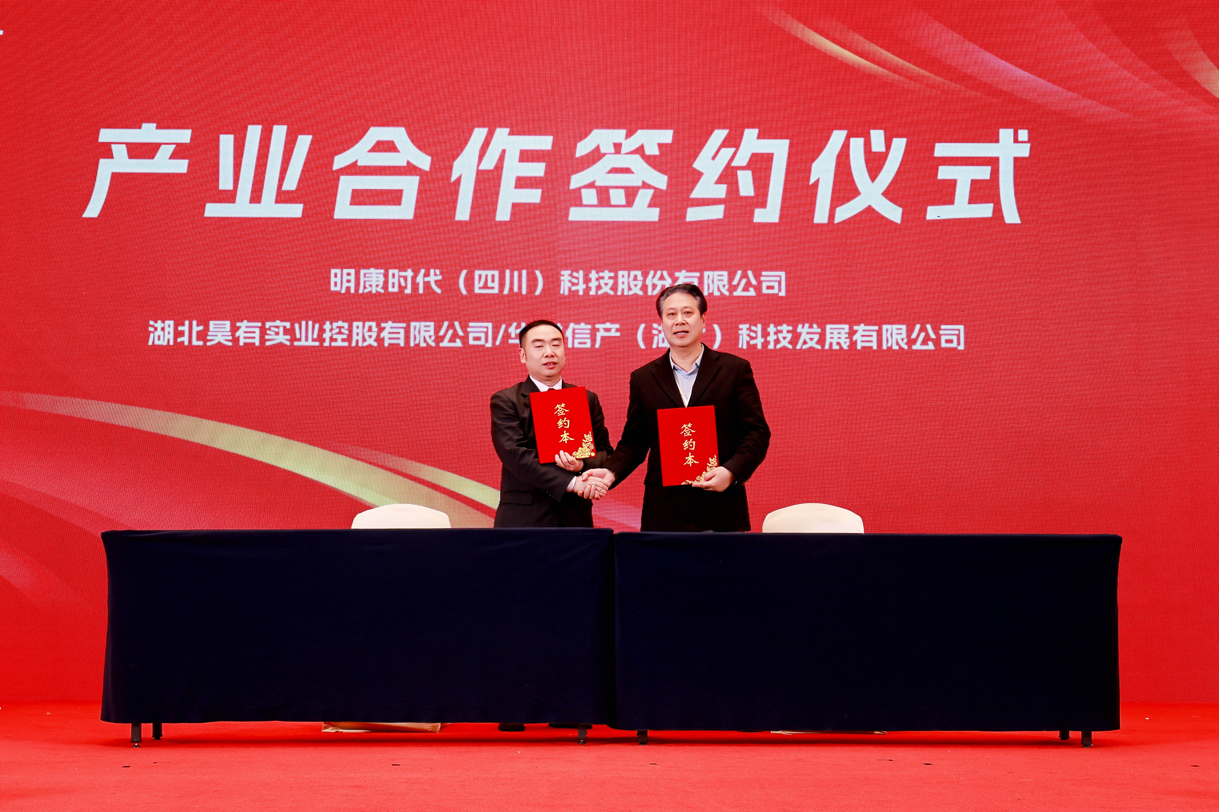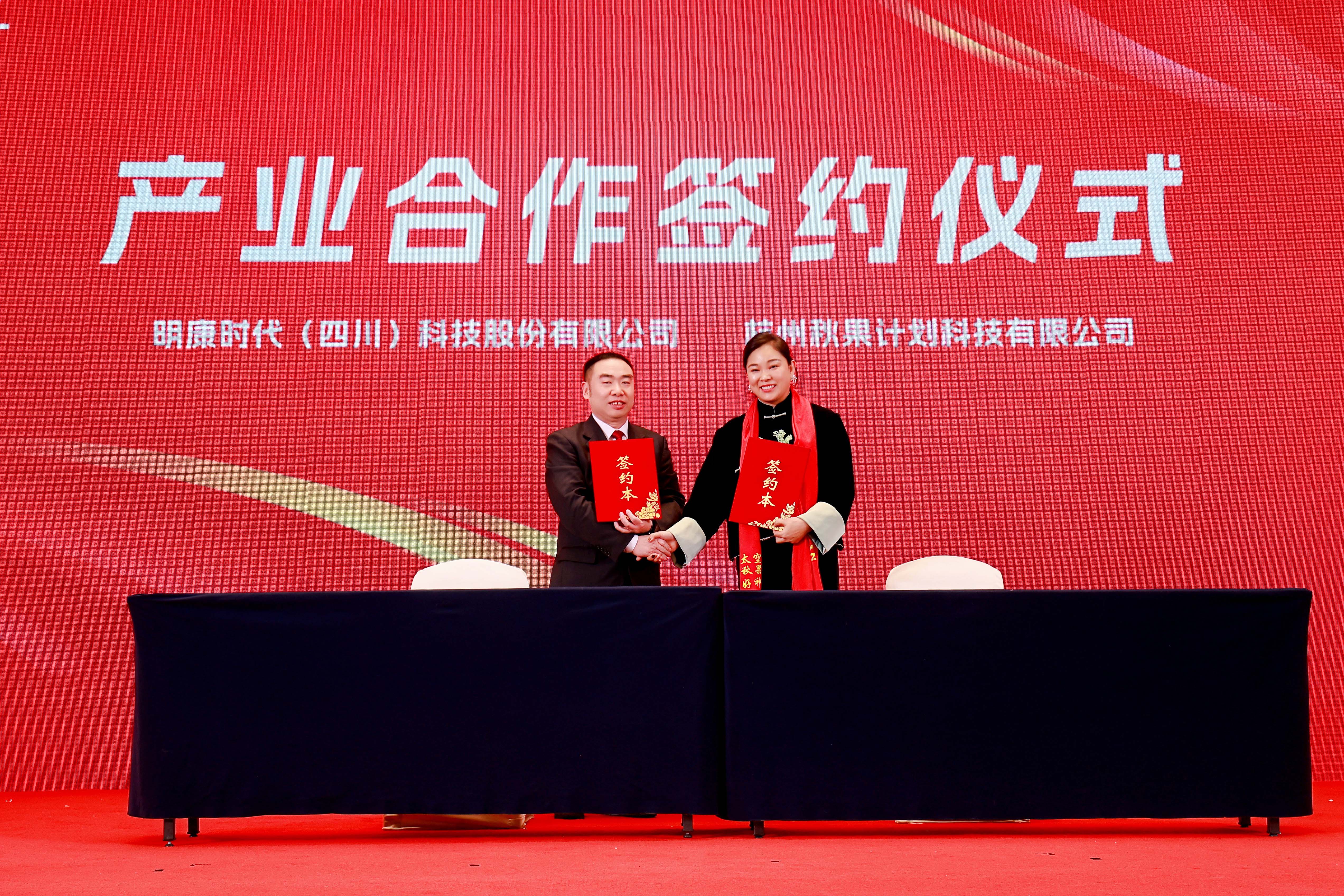 大会进入战略签约环节,明康时代(四川)科技股份有限公司分别同领头扬科技(深圳)有限公司、湖北昊有实业控股有限公司/华财信产(湖北)科技发展有限公司、杭州秋果计划科技有限公司进行了签约仪式。