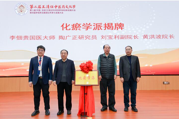 在化瘀学派立派仪式中,中华中医药学会副会长王国辰致立派辞。李佃贵国医大师、陶广正研究员、刘宝利副院长、黄洪波院长共同为“化瘀学派”揭牌。此次揭牌,标志着以王清任“活血化瘀”学术思想为核心的学派正式确立。