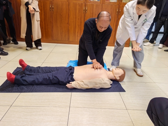 纸上得来终觉浅,唯有实践出真知。理论讲解结束后,培训进入实操演练环节。讲师利用专业急救模拟人,逐一演示胸外按压的定位、力度、频率及人工呼吸的规范动作,将复杂流程分解为易懂易学的步骤。大家学习热情高涨,纷纷主动上前实操体验,在工作人员的协助下反复练习按压节奏与呼吸配合。讲师穿梭在学员之间,对每一位老同志的动作进行一对一细致点评,及时纠正按压深度不足、呼吸衔接不畅等问题,确保大家掌握规范有效的急救技能。