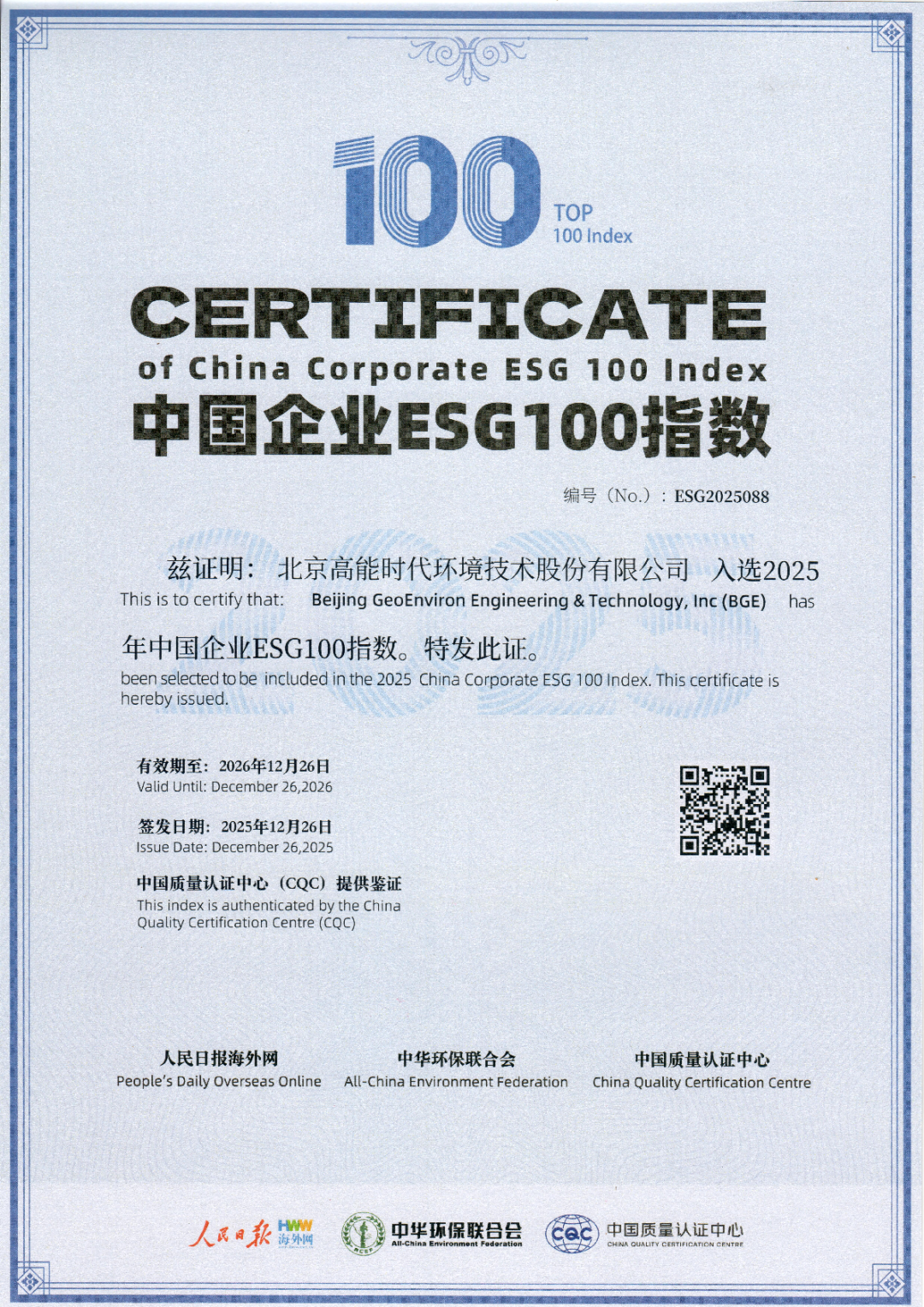 近日,由人民日报海外网、中华环保联合会和中国质量认证中心联合主办的“第三届中国品牌形象海外传播论坛暨2025中国企业ESG蓝皮书发布会”在北京圆满落幕。会上,“2025中国企业ESG100指数”榜单揭晓,高能环境凭借在环境、社会与治理(ESG)领域的长期实践与卓越表现,成功入选。