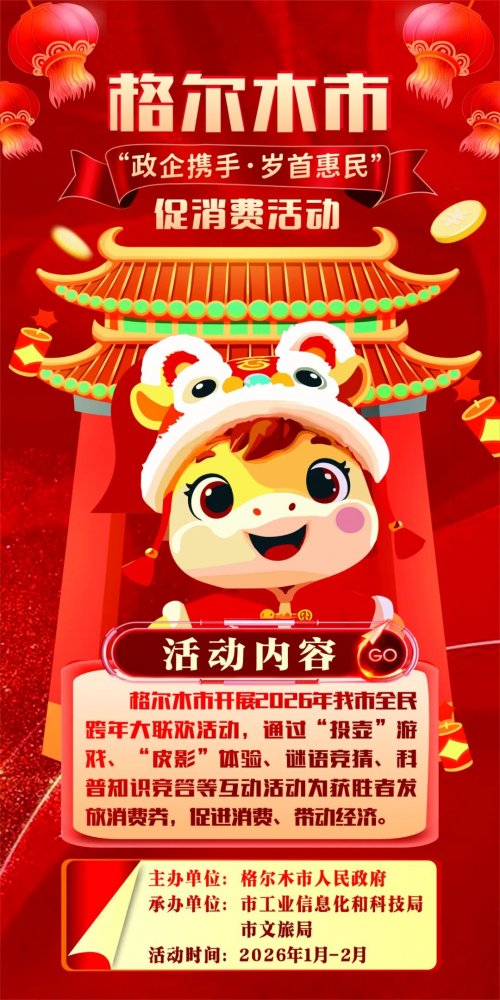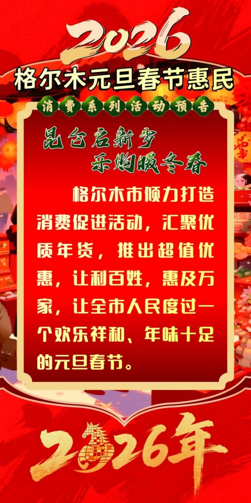 12月30日,从青海省海西蒙古族藏族自治州格尔木市相关部门了解到,该市将在元旦春节期间推出惠民消费系列活动,通过政企携手推出消费券发放、年货礼包特惠、全民乐购集市等八大类活动,汇聚优质资源、释放超值优惠,让全市群众在欢乐祥和的氛围中欢度双节,同时激活消费市场、带动经济增长。