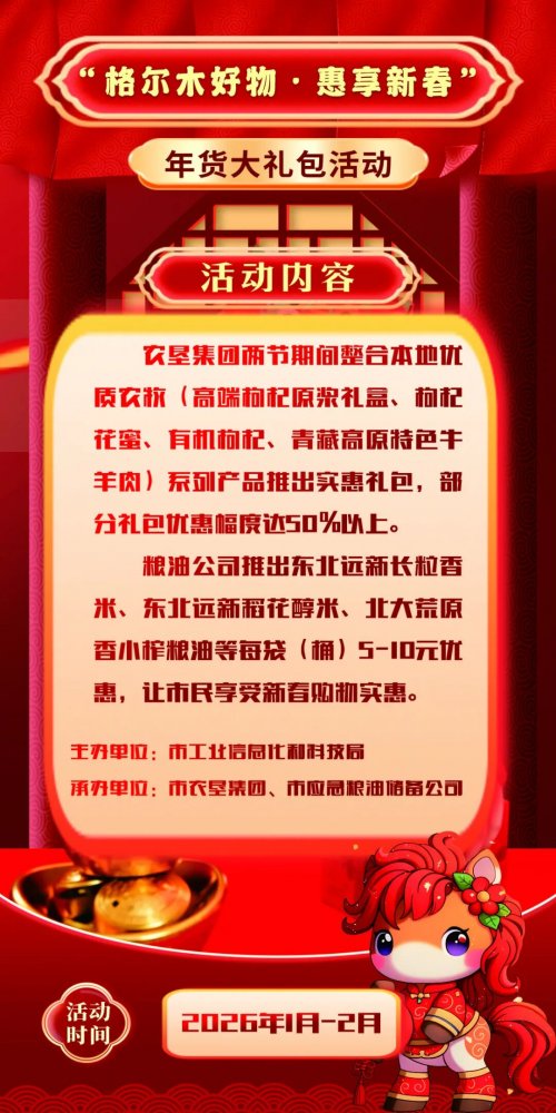 本次系列活动亮点纷呈,互动惠民与实物优惠兼顾。其中,“政企携手·岁首惠民”活动设置投壶、皮影体验等趣味互动,获胜者可获消费券;农垦集团、粮油公司推出的“格尔木好物·惠享新春”年货礼包,本地优质农牧产品优惠幅度超50%,粮油产品每袋(桶)让利5——10元。