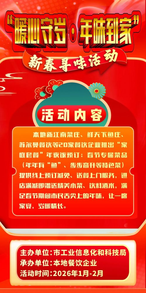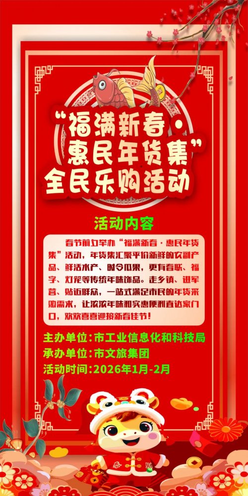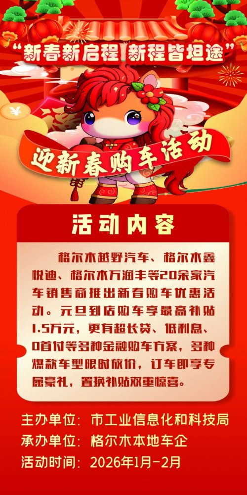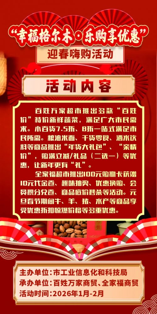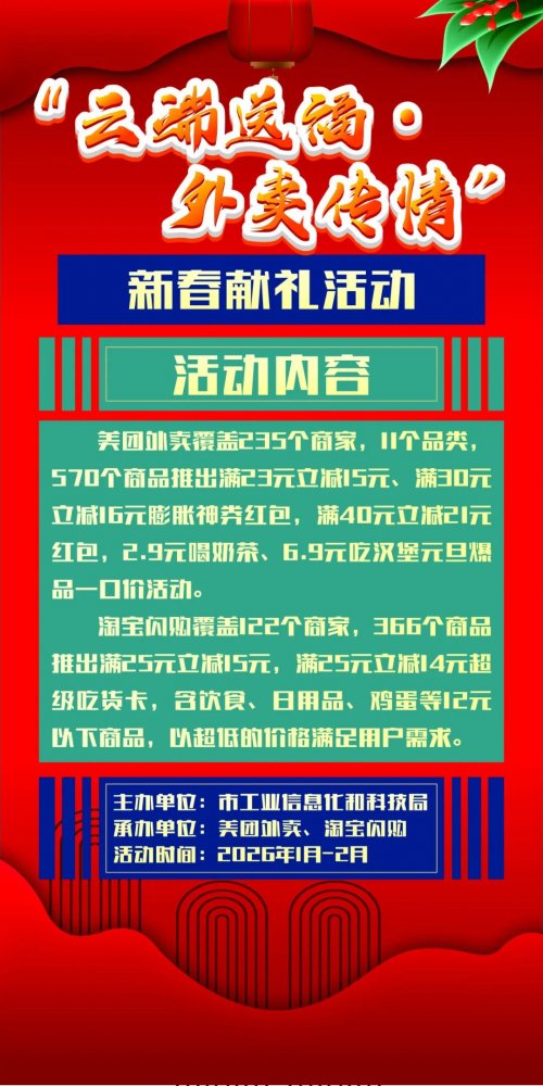 商超与餐饮领域同样福利丰厚,百姓万家、全家福等超市推出特价蔬菜、折扣商品及购满立减活动;20家本地餐饮企业提供年夜饭预订、送餐上门等服务。美团外卖、淘宝闪购同步推出大额满减券及爆品一口价活动,覆盖多品类商品。此外,20余家本地车企推出最高1.5万元购车补贴、金融优惠及置换福利。(供稿人:格尔木市委宣传部 蔡得军 )