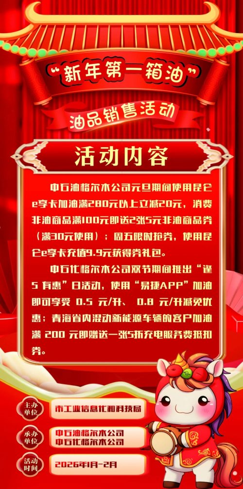 春节前夕开启的“福满新春·惠民年货集”将走进乡镇、军营,汇聚农副产品、时令瓜果及传统年味饰品,实现年货采购一站式服务。油品消费方面,中石油、中石化格尔木公司推出加油立减、充值送券等优惠,新能源车主还可享充电服务费抵扣福利。