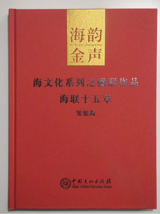 为了宣传、推介以邹继海先生为代表的“海派”楹联文化艺术,由央广国际文化交流艺术委员会、广东楹联学会主办,中国文化出版社发行的“海韵金声·海文化系列创始人邹继海之《海联十五章》”于今问世,印数7万册。此书收摭其创作的1,477副成联和70比求对之出句,且按“联叩心扉”“联花缀景”“联播化雨”“联赞新村”“联红大地”“联报春讯”“联系商谊”“联结友义”“联贺喜庆”“联挽鹤驾”“联弘法雨”“联昭忠考”“联生意趣”“联观万象”“联凤求凰”等十五类予以蒐辑成册。品读《海联十五章》,我们不难发现,邹继海先生的联语立意高远,主题鲜明,内容贞实,技巧娴熟,其风格时而雄浑,时而典丽,时而高古,时而通俗,其遣句或长或短,却尽得实用楹联之三味。