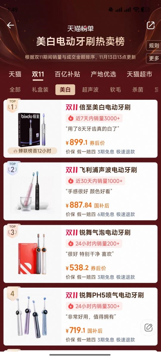 2025年,倍至迭代升级了智能蓝光美白电动牙刷,让消费者在刷牙过程中即可实现牙齿美白。通过技术创新,该美白电动牙刷能够精准控制蓝光波段,搭配温和的非过氧化氢类美白成分牙膏,实现了家庭场景下的安全美白。据了解,在2025年“双11”期间,倍至蓝光刷累计销售额超过4500万元,3万余台备货迅速售罄。