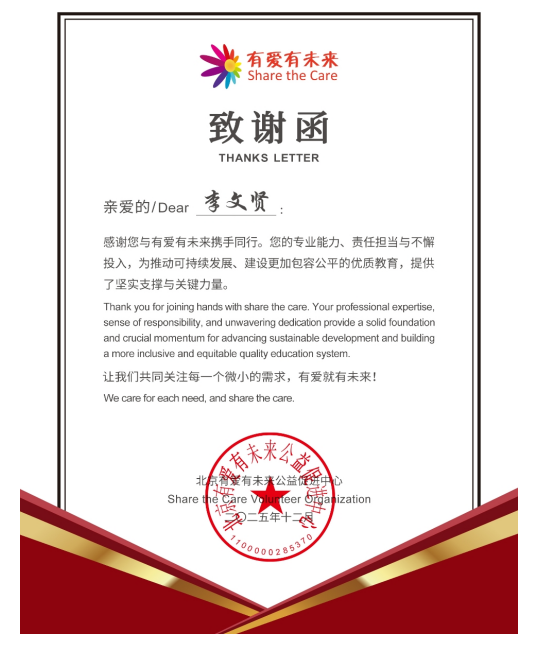 其中,天创信用与“有爱有未来”开展深度协作,将责任精神注入企业文化,通过资金支持、员工志愿服务等多种方式,共同助力公益项目的落地、拓展与创新,获评“有爱有未来”认证的“志愿服务三星级企业”称号。