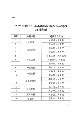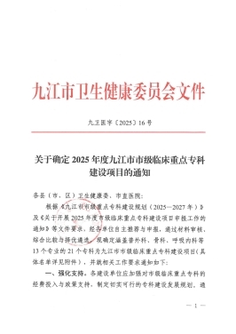 近日,九江市卫生健康委公布2025年度市级临床重点专科建设项目名单,我院心血管内科获批成为九江市市级临床重点专科。