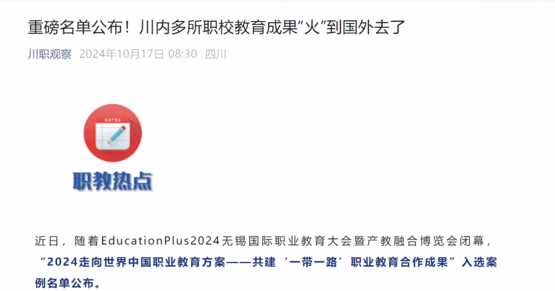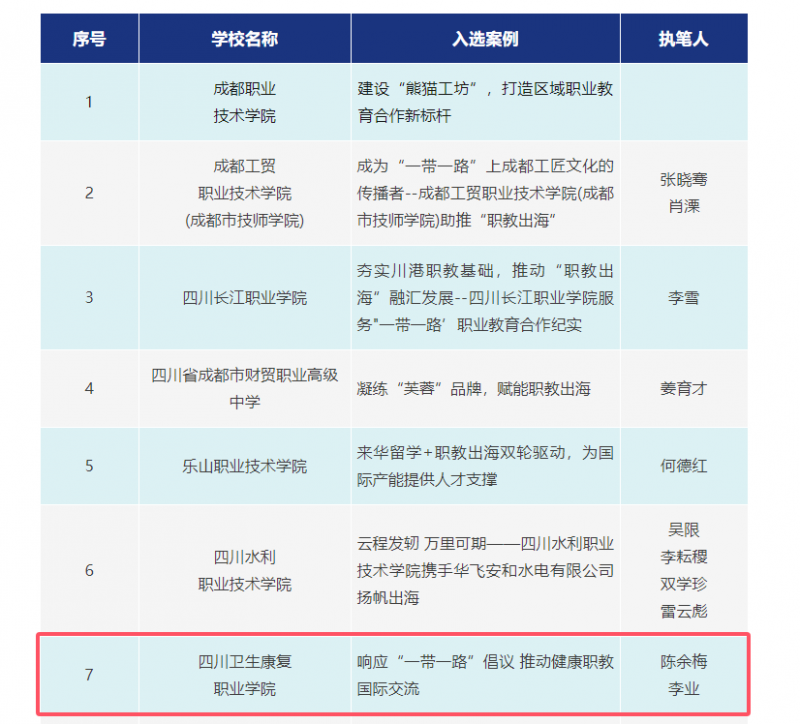 三是强化特色亮点凝练。向合作国家推广护理专业学生管理工作典型案例2个,典型案例《响应“一带一路”倡议 推动健康职教国际交流》入选2024年走向世界中国职业教育方案——共建“一带一路”职业教育合作成果优秀案例,持续总结凝练国际交流合作特色亮点,擦亮学校国际职教品牌。(供稿单位:川卫康院)