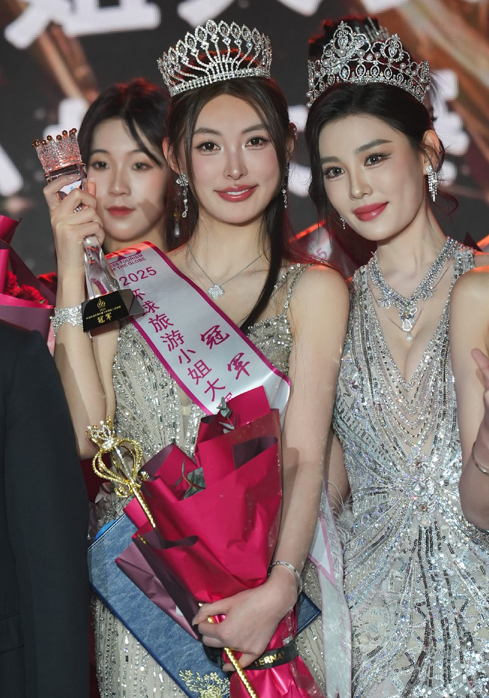 2025环球旅游小姐前三甲(中:冠军王语会、左一:季军刘怡萍、右一:亚军候君宜)