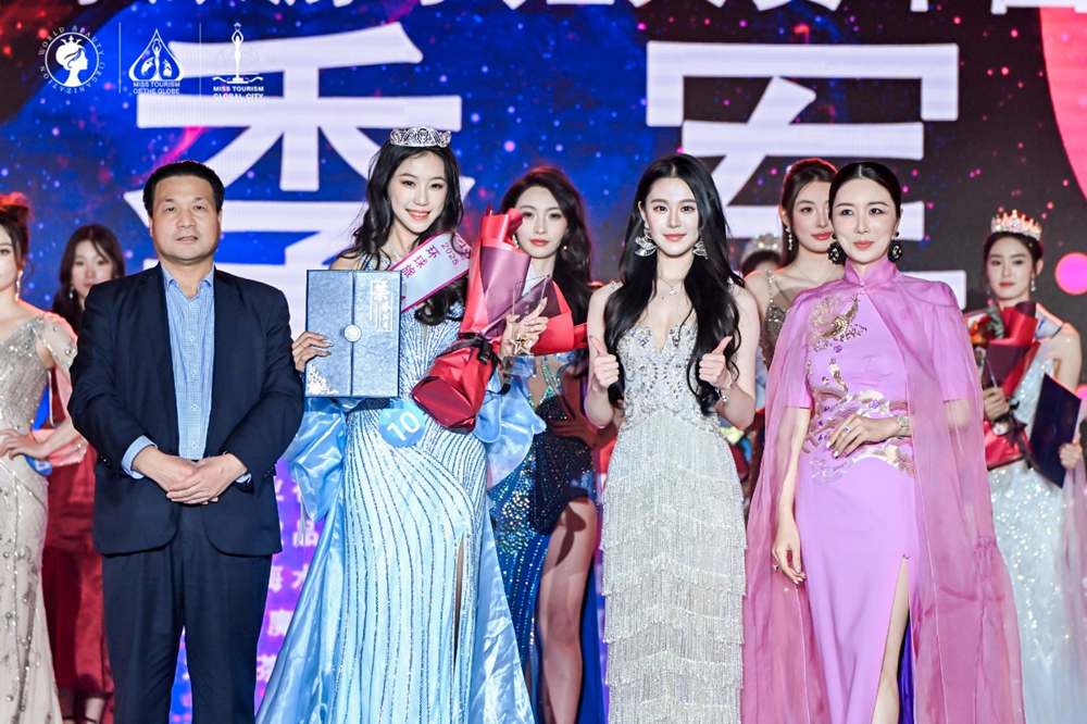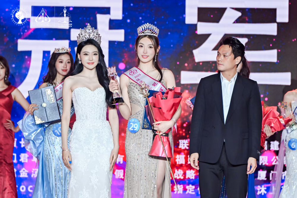 2025环球国际小姐中国总冠军朱琳(右一)为获得亚军的候君宜颁奖