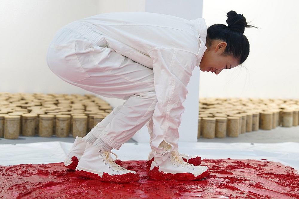 开幕式现场,艺术家杨烨炘邀请一男一女,将双手双脚都穿上鞋子,用四只脚作画。三人在沾满颜料的油画板上不断爬行,反复转圈,一直到精疲力尽,画板上留下了艺术家爬行的痕迹。至此,“爬行动物”行动油画宣告完成。