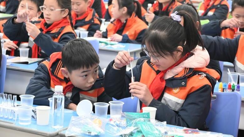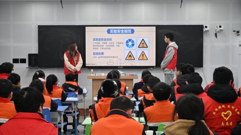 在凤凰实验学校的化学实验室里,小学生们在大学生志愿者的带领下,见证碳酸氢钠与醋酸钠反应生成的二氧化碳将气球“吹”起,观察彩色泡沫模拟的“火山爆发”,在动手实践中直观感受化学反应与气体压强的科学原理。