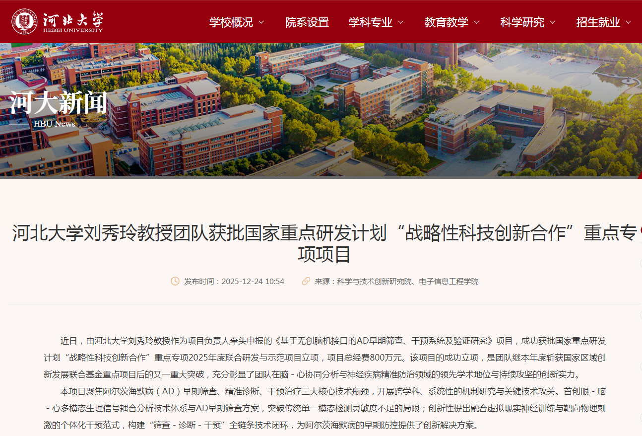 近日,由河北大学刘秀玲教授牵头申报的《基于无创脑机接口的AD早期筛查、干预系统及验证研究》项目(项目编号:2025YFE0218700),成功获批国家重点研发计划“战略性科技创新合作”重点专项2025年度联合研发与示范项目立项,项目总经费800万元。秦皇岛市惠斯安普医学系统股份有限公司作为核心参与单位,将凭借在脑机接口、认知障碍筛查干预领域的技术积淀与产业转化能力,深度参与该国家级项目的关键技术攻关与成果落地,为阿尔茨海默病(AD)早期防控提供中国原创的产业解决方案。