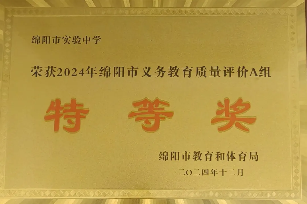 近日,绵阳市教育和体育局发布2024-2025学年义务教育质量评价结果通报,绵阳市实验中学(绵阳七中)凭借卓越的办学品质与综合育人成效,荣获绵阳市初中阶段义务教育质量评价“A组表现特别突出学校”荣誉称号(初中最高奖项)。
