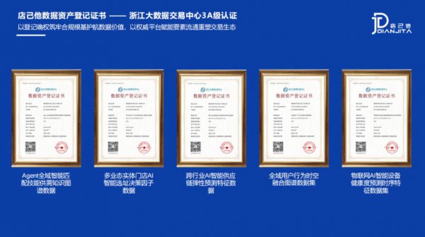 作为唯一拥有数据知识产权登记证书、电子数据存证证书、数据交易证书的合规主体,AI 店己他的多项核心数据已获浙江大数据交易中心 AAA 级资产认证并完成登记,打通了 “数据 - 资产 - 价值” 的全链路转化通道,为平台的合规运营与可持续发展奠定了坚实基础。