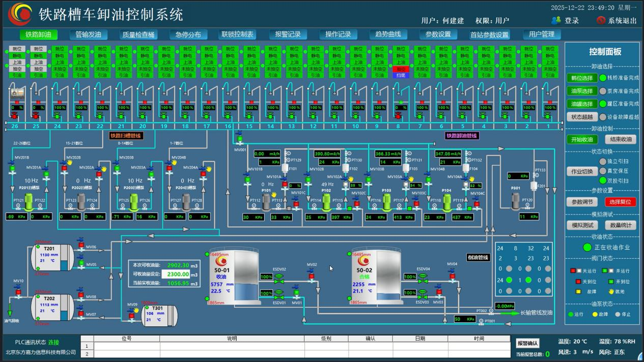 从实际作业流程来看,系统贯穿槽车驶入、卸油两大核心阶段。在槽车驶入阶段,铁路槽车智能校核系统智能完成车号识别、校对定位、计算来油量、核对误差。人工仅需取样化验与量油(测量高度、密度、温度),量油数据实时上传至计量系统并自动生成油品数量。该阶段耗时仅为原来的1/3,每次可节省2小时以上,有效规避超时罚款风险。进入卸油阶段,系统通过在工艺管道、泵房及控制室部署电动阀、传感器、PLC及智能控制后台,将栈桥作业任务减少十余项,仅保留槽车开盖、鹤管收放等必要人工操作,实现了引油、卸油、扫底等全流程的远程自动控制与智能调度,同时实现了泵房与罐区的现场无人化操作。