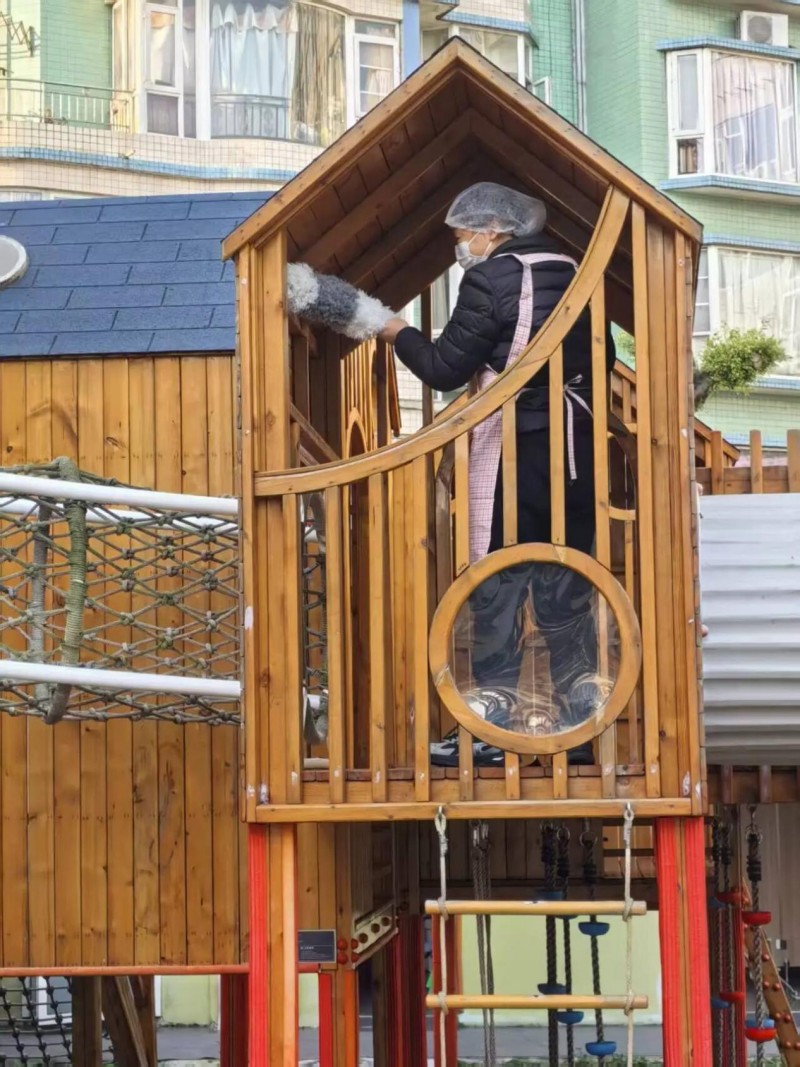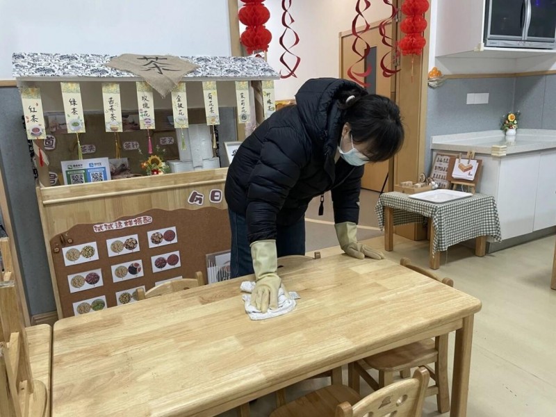 保洁组人员则像幼儿园里的“美容师”,用一双巧手打理着园区的每一个角落,默默守护着宝贝们的活动空间。他们严格按照标准化流程操作,确保每一个细节都无死角、无残留,为孩子们的健康成长提供了有力保障。