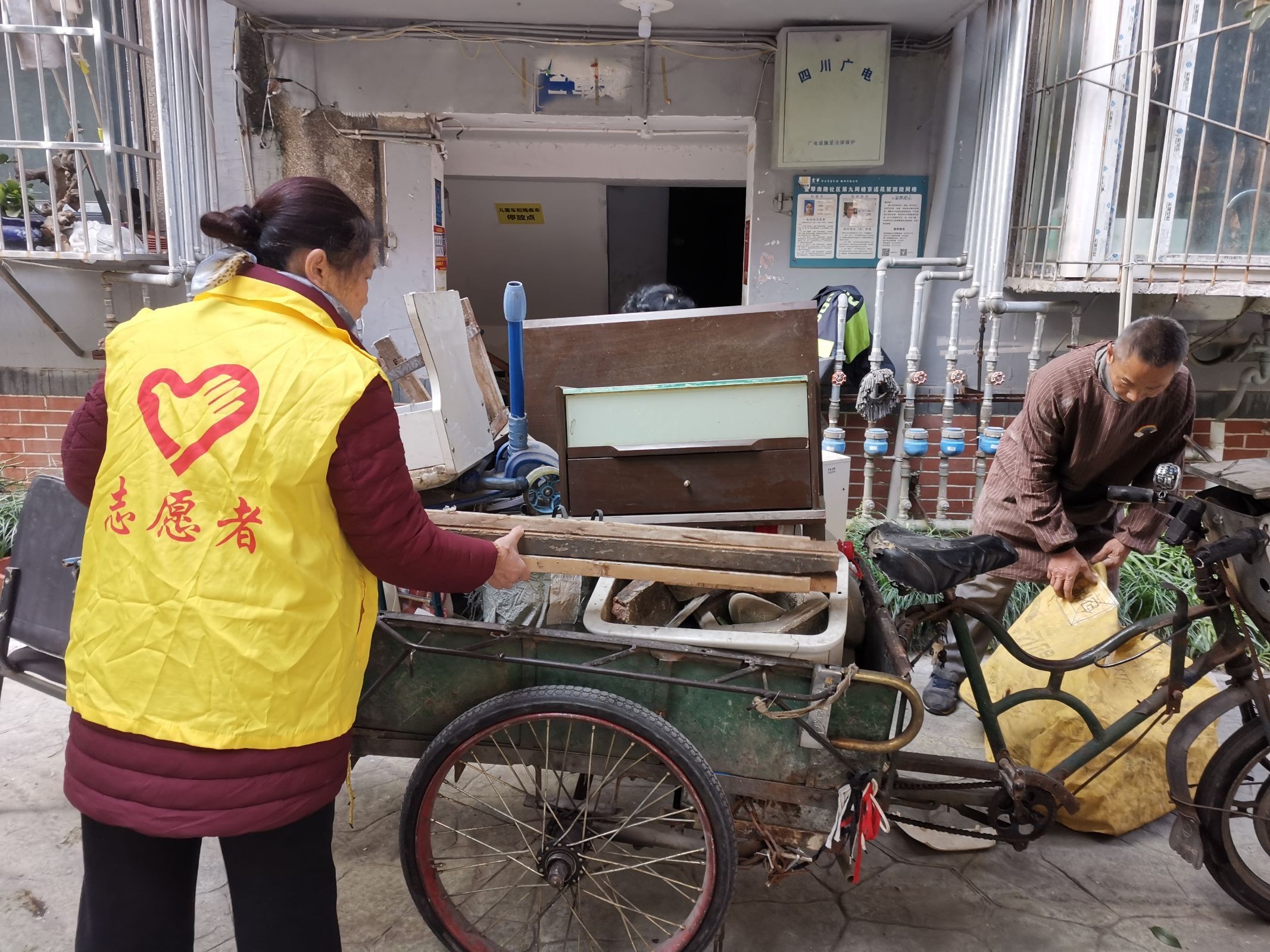 荣光巷大院共有8个院落,社区网格员和院委会首先对院落内散放的各类杂物开展系统性分类处理工作。他们开展全面巡查,将砖石、废弃家具、装修废料等归为“建筑垃圾”范畴,日常包装、纸壳旧衣等生活废弃物明确划分为“生活垃圾”大类。然后使用专用标识袋分别盛装两类垃圾进行集中清运处理,切实保障院落环境的长效整洁与管理秩序。