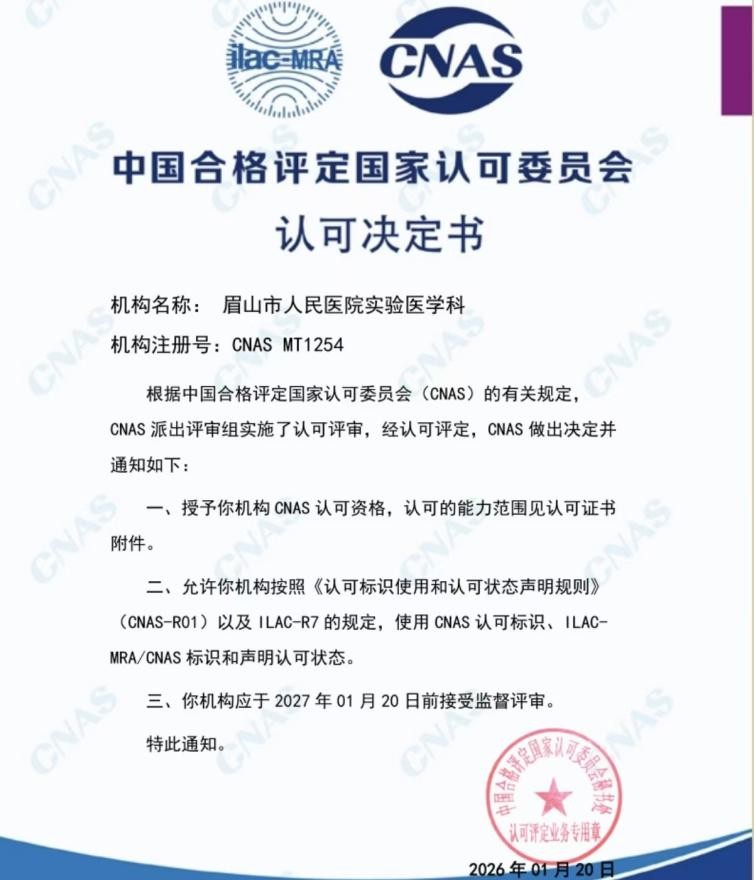 自2023年10月起,在眉山市人民医院党委统筹领导下,实验医学科启动ISO 15189认可筹备工作。团队以全流程质量管理为核心,系统性推进质量管理体系规范、仪器试剂性能验证、实验室风险评估、临床沟通协作、标本采集运输培训、实验室信息系统升级等多项重点工作,对检验前、检验中、检验后各环节实施多维度、多层次管控,通过内部审核、管理评审等机制持续优化服务流程,历时两年完成标准化建设。2025年10月,CNAS专家组开展现场评审,对科室的技术能力与管理水平给予高度认可,最终于2026年1月20日正式授予认可证书。