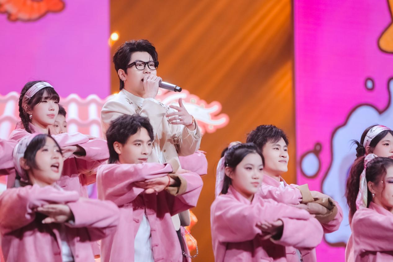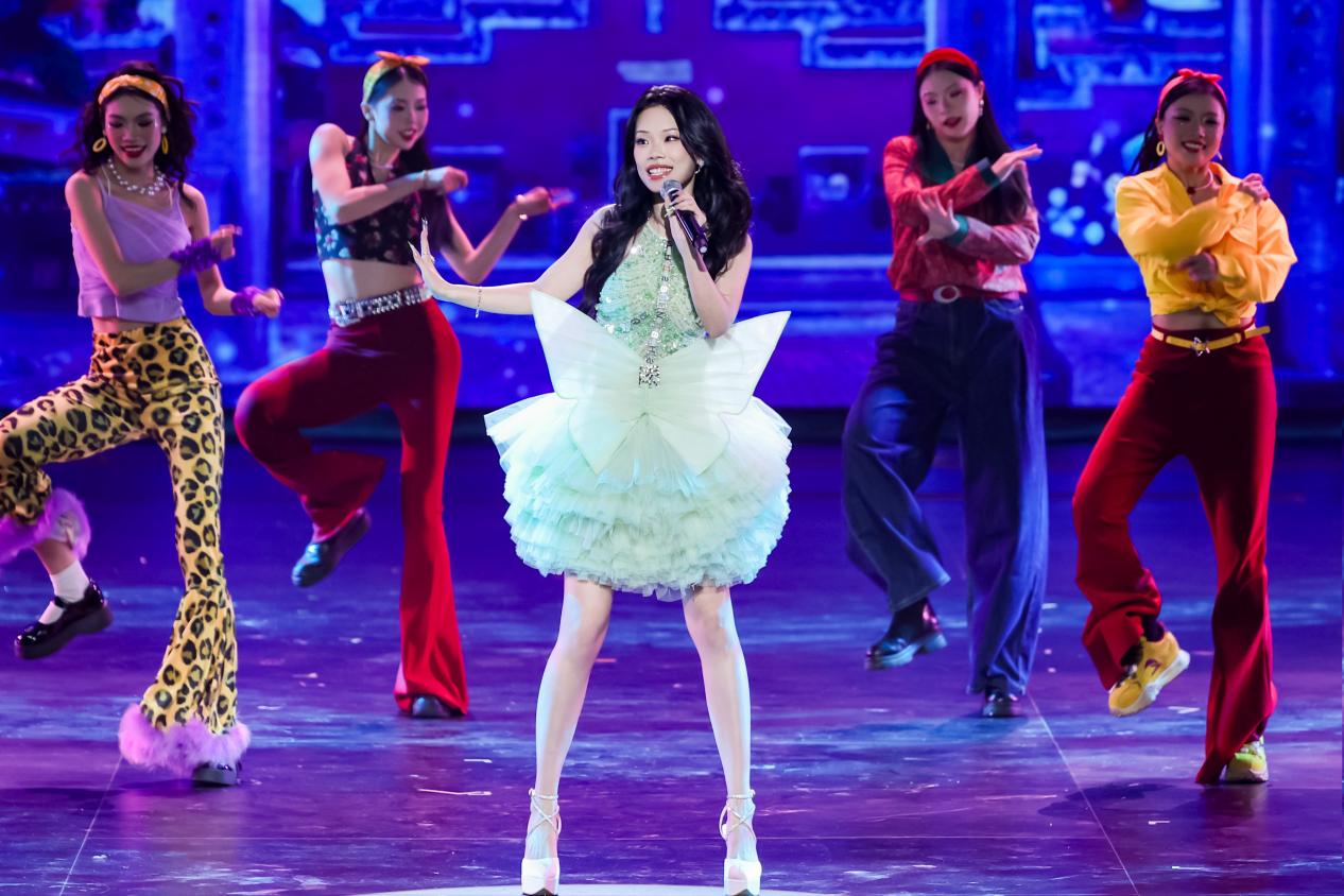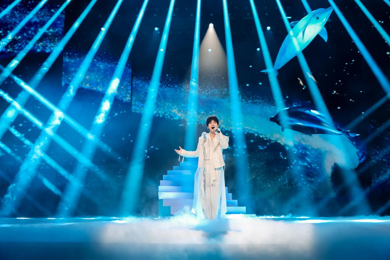 小鬼-王琳凯领衔的歌舞《Raining》中,灯光随律动变幻成漫天雨丝,将青年人的自由律动转化为可视的艺术张力;暖黄灯光、霓虹招牌、老物件陈设等共同营造的复古舞台上,万妮达与姜育恒联袂献唱《雕刻时光的人》,质感金嗓瞬间将观众拉回上世纪八十年代,唤醒两岸共同的文化记忆;《潮生东方》里,随着徐均朔清越澎湃的歌声,仿真鲸鱼浮空飞行器遨游在“深海奇景”中,呈现福建“向海而生、开拓进取”的壮阔图景。