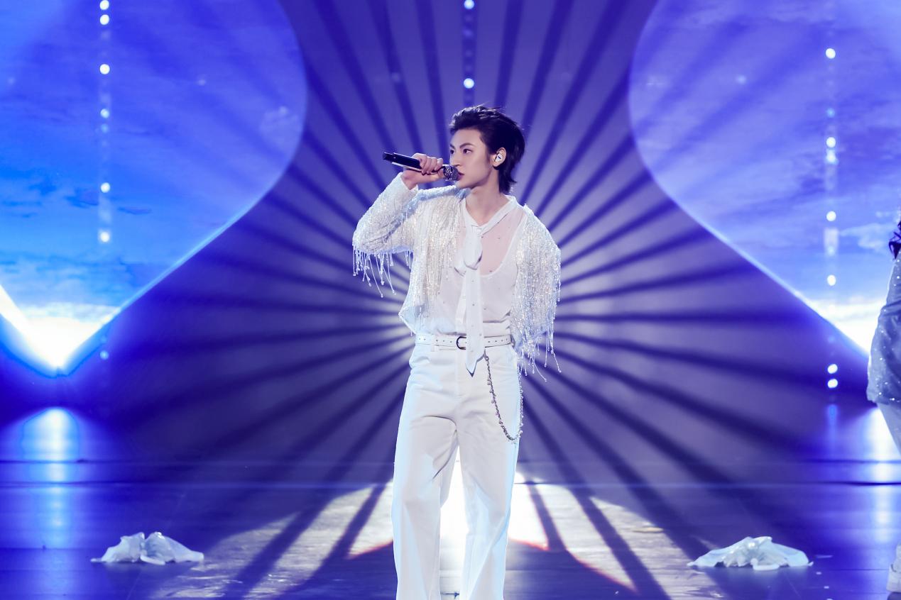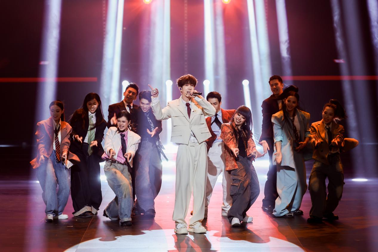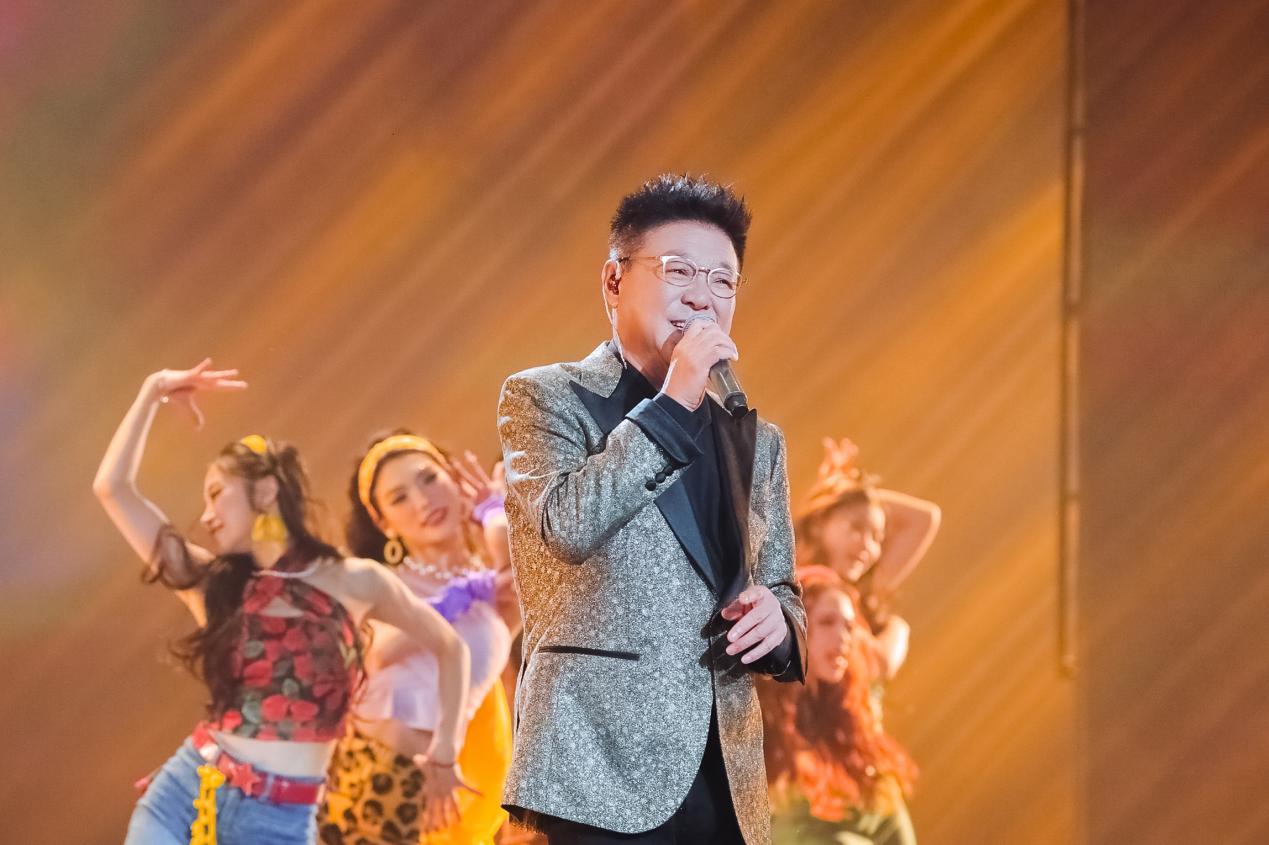 小鬼-王琳凯领衔的歌舞《Raining》中,灯光随律动变幻成漫天雨丝,将青年人的自由律动转化为可视的艺术张力;暖黄灯光、霓虹招牌、老物件陈设等共同营造的复古舞台上,万妮达与姜育恒联袂献唱《雕刻时光的人》,质感金嗓瞬间将观众拉回上世纪八十年代,唤醒两岸共同的文化记忆;《潮生东方》里,随着徐均朔清越澎湃的歌声,仿真鲸鱼浮空飞行器遨游在“深海奇景”中,呈现福建“向海而生、开拓进取”的壮阔图景。