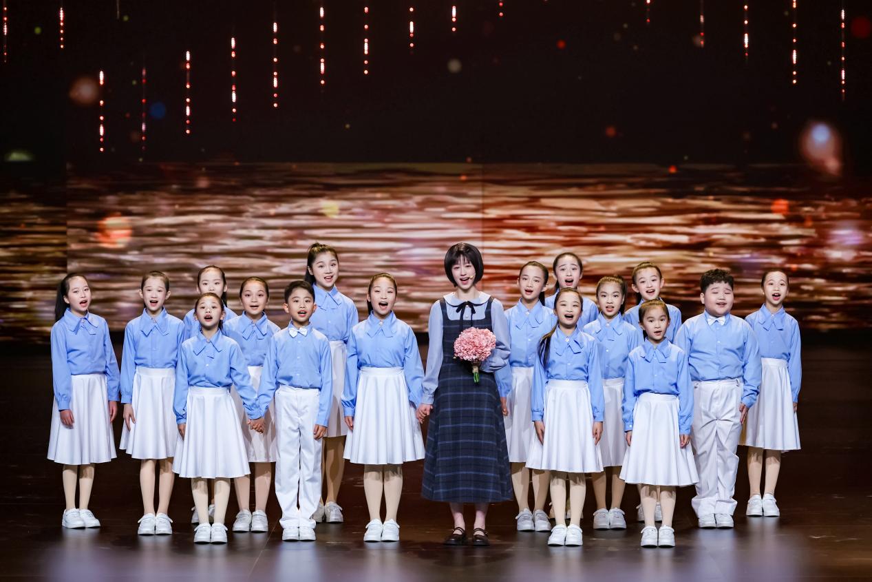 情景音画《团圆》以福州籍英雄吴石与女儿的故事为切口,用一张旧船票、一幅书法作品“家”串联起岁月记忆。舞台上,16岁的吴学成哼着“月光光,照池塘”的福建童谣,从对父亲“拆散家庭”的不解,到读懂“家是千万同胞与祖国”的深意,最终明白父亲“为什么宁愿背负这份遗憾,也不肯回头”。“走丢了不要怕呀,会重逢,会重逢……”,捧着象征“团圆”的绣球花的海之声少年唱队缓缓登场,莹莹灯球降下——闽人浩荡的家国情怀,在这一刻化作千万盏灯火,照亮英雄们回家的路。