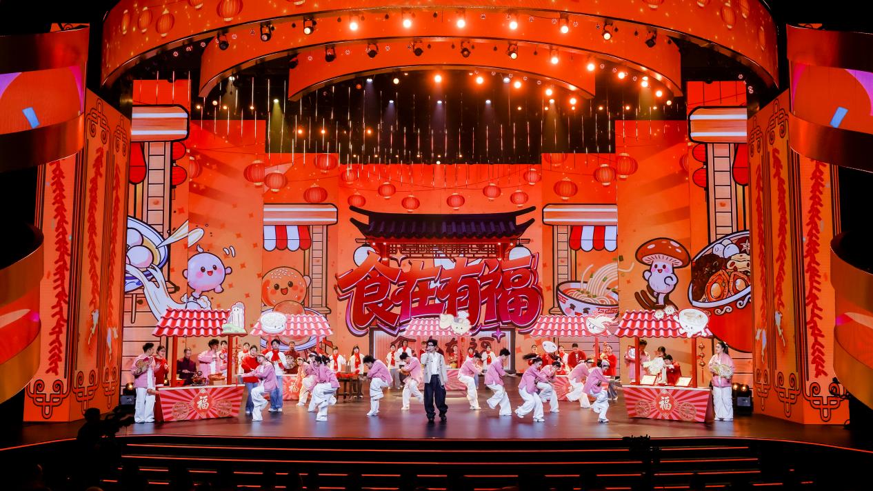 歌舞《食在有福》将八闽烟火气“搬”上了舞台:在闽地各种方言的叫卖声中,佛跳墙、肉燕、鱼丸、线面、沙县小吃等非遗小吃传承人推着小吃摊登台,闽籍歌手翁杰将它们和莆田卤面、福鼎肉片、姜母鸭、蚵仔煎、沙茶面、芋子包、南平光饼等特色美食串联成曲。