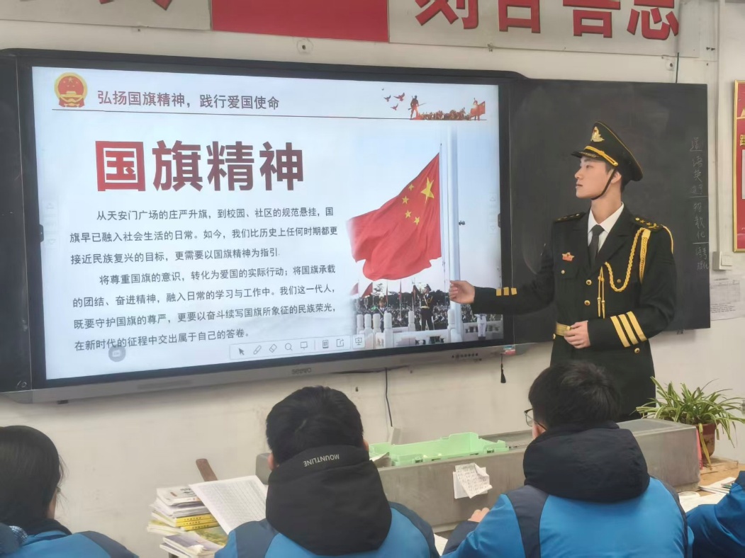 活动在庄严的氛围中拉开帷幕。队员身着国旗护卫队礼服,以挺拔的身姿和坚定的目光,向同学们讲述了国旗的象征意义与精神内涵。从五星红旗的设计理念到升旗仪式的规范流程,从国旗法的基本条款到国旗背后的英雄故事,队员们的讲述既有历史的厚重,也有时代的温度。台下同学们屏息聆听,目光中流露出对国旗的敬仰与对祖国的热爱。