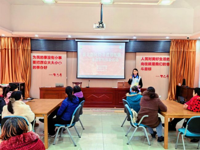 活动伊始,熊佳怡同学以非遗文化的起源与传承为切入点,娓娓道来剪纸艺术的发展脉络。从古代民间的窗花剪纸,到现代融入多元创意的剪纸作品,将剪纸这门古老技艺的历史底蕴与艺术价值徐徐展现。为了让大家更全面地感受非遗文化的多元魅力,熊佳怡还以剪纸为核心,拓展介绍了锡器制作这一江南特色非遗技艺,用通俗的语言讲解锡器与剪纸在文化内涵、审美表达上的相通之处,让社区居民在了解剪纸的同时,领略到江南非遗家族的别样风采,进一步加深了对本土传统文化的认知与认同。