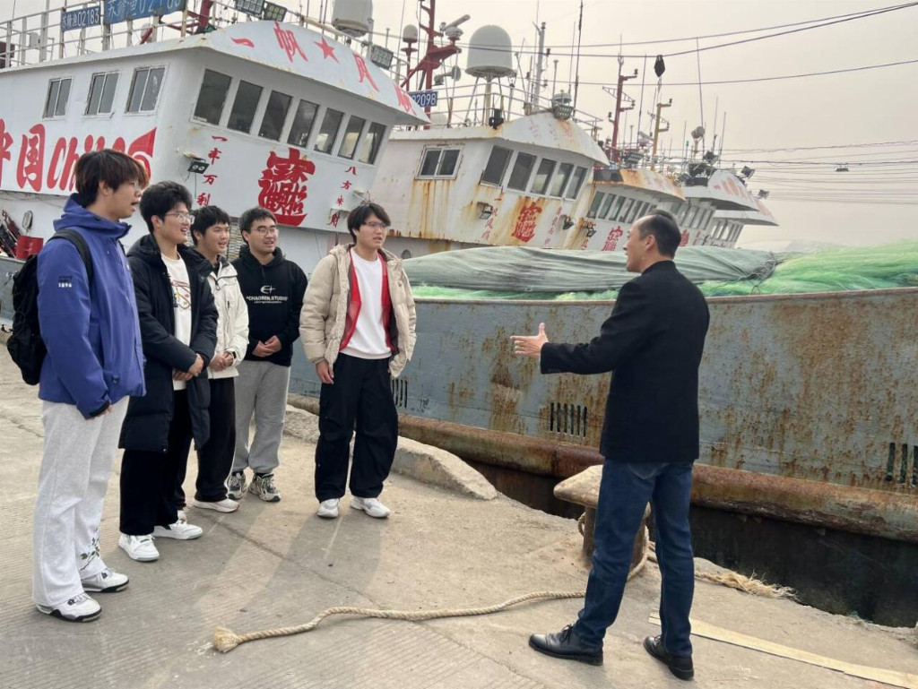 稍作休整后,队员们便来到码头作业区,跟随国家级“吕四渔民号子”传承人开启非遗学习之旅。传承人站在斑驳的渔船旁,用高亢原生态的号子声,将队员们带入吕四渔民闯海弄潮的历史场景。他细致拆解《起锚号》《拔网号》等经典号子的节奏韵律,队员们围在身旁认真记录、逐句模仿,在一呼一应的和声中,沉浸式触摸到这项濒危技艺的鲜活生命力,深刻理解了号子背后承载的渔家智慧与文化价值。