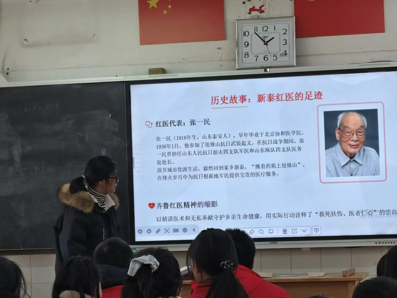 稍作休整后,队员们便走进新泰一中的课堂,开启红医精神宣讲之旅。宣讲人站在明亮的讲台前,用饱含深情的讲述,将师生们带入新泰籍红医代表张一民先生的革命岁月。他细致拆解张一民先生在战火中救死扶伤、在困境中坚守医者初心的动人故事,师生们围坐身旁认真聆听、凝神思索,在一段段鲜活的事迹中,沉浸式触摸到红医精神的鲜活生命力,深刻理解了“敬佑生命、救死扶伤、甘于奉献、大爱无疆”背后承载的医者使命与家国情怀。