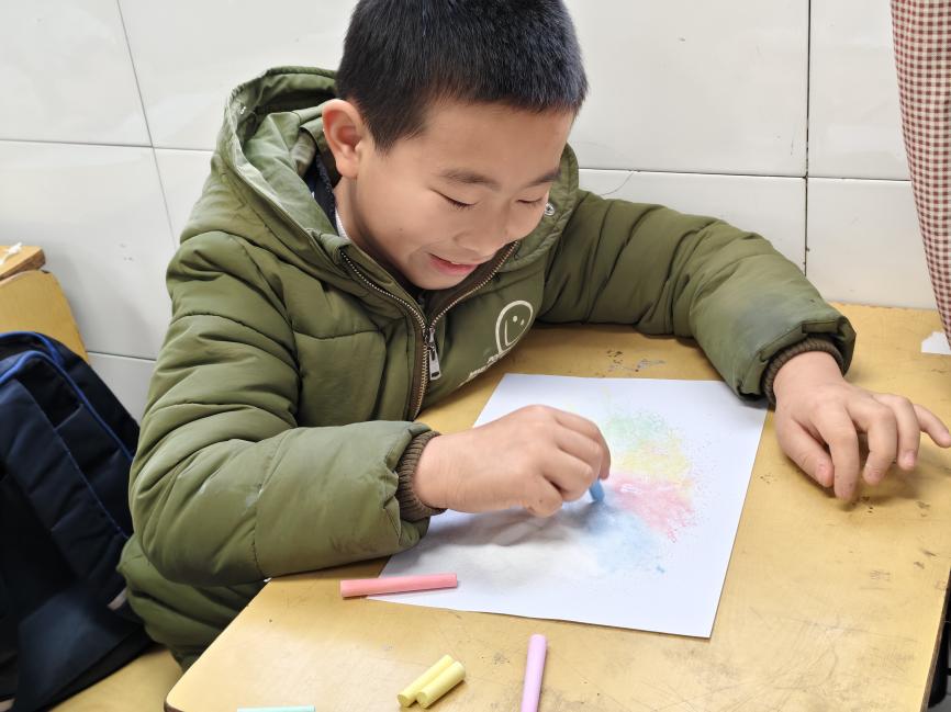 跨越千里赴湖南,山东大学“心沐同行”团队走进长沙市麻田村、怀化市辰溪县多所乡村学校,将温暖与专业带到孩子们身边。在麻田村的冬日课堂上,志愿者带领孩子们用纸巾、皮筋与彩笔制作“晴天娃娃”,孩子们将内心的情绪与期许,一笔一画绘在娃娃脸上,在指尖的创作中正视情绪起伏,学会接纳每一种情绪的存在,让阳光心态慢慢生长。在《“盐”画心声》课程里,活泼的“情绪热身操”让孩子们在模仿中唤醒情绪感知,《头脑特工队》动画片段引导大家读懂喜、怒、哀、惧的独特价值;盐画创作环节,孩子们在冥想捕捉情绪后,用盐粒与色彩勾勒内心,将忐忑、委屈、喜悦等情绪化作斑斓作品,在无声创作里完成心灵的温柔释放。