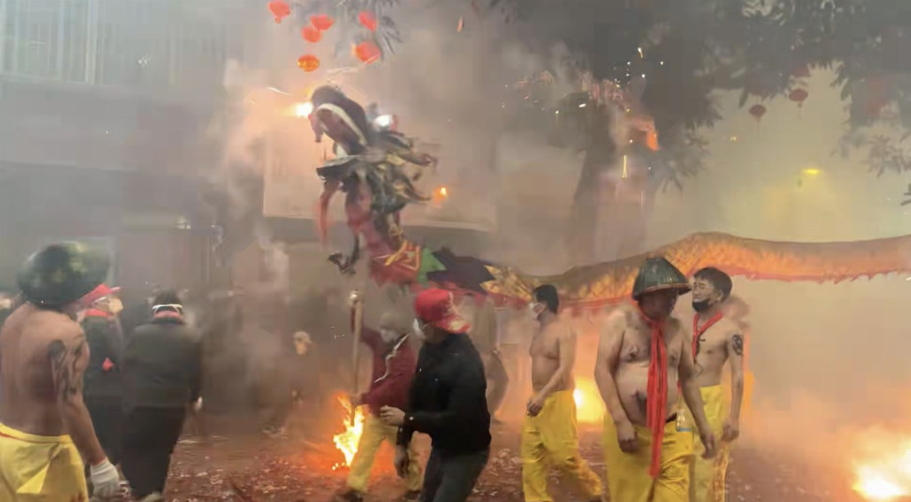 团队成员在宾州古镇现场看到,夜幕降临后,105条炮龙同时亮相街巷,在鞭炮齐鸣、烟火升腾中翻腾起舞。赤膊舞龙人奋勇穿梭,民众围聚观赏、参与“钻龙肚”祈福,沉浸式民俗氛围浓厚,展现出宾阳炮龙节独有的勇气精神与乡土凝聚力。