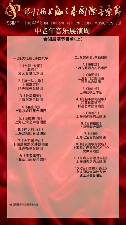 2026年,第四十一届上海之春国际音乐节·上海中老年音乐展演周精彩启幕。活动以“欢歌忆岁月,逐梦向未来”为主题,正值“十五五”规划开局、喜迎中国共产党成立105周年、红军长征胜利90周年的重要历史节点。展演周以红色经典与时代旋律为主线,深情回望百年奋斗征程,充分展现新时代中老年音乐爱好者的艺术风采与精神风貌。