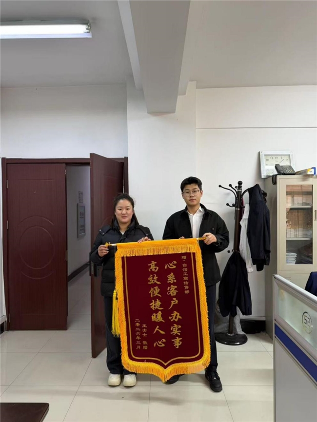 一面锦旗,一份认可,更是一份责任。此次事件的妥善处置,是工商银行践行“以客户为中心”服务理念的生动缩影,也是统筹部署、团队高效协作的成果体现。一直以来,工行保定白沟支行在上级领导的带领下,不断优化服务流程、提升服务质效,针对客户急难愁盼问题,积极推行“特事特办、急事急办”服务模式,用专业能力和暖心服务赢得了客户的广泛信赖。