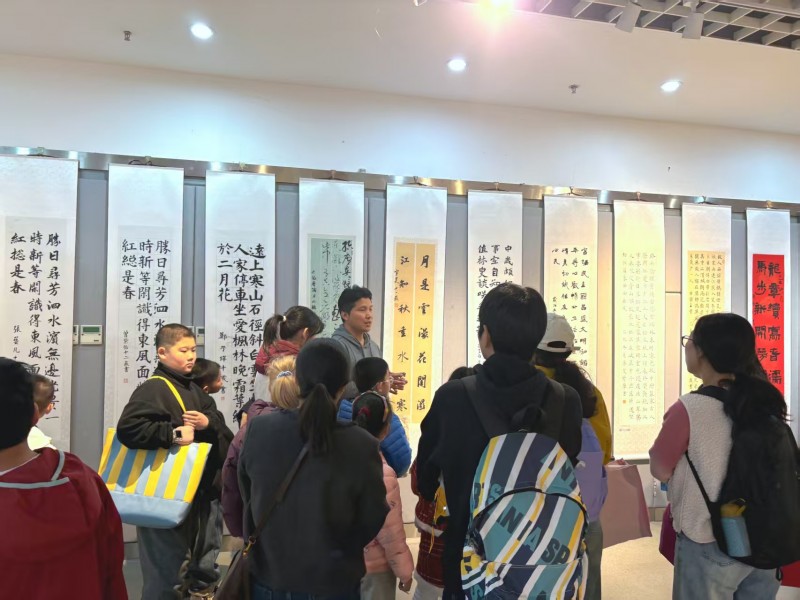 开幕式上,福建省教育学会书法教育委员会、宁化县教育局、洛江区教育局相关负责人先后致辞,分别阐述了两地书法教育的发展历程、特色成果与未来规划,表达了以此次联展为契机,深化山海教育协作、共传中华书法文脉的美好愿景。致辞中提到,宁化与洛江虽隔山海,却因书法教育结下深厚情缘,自教育山海协作启动以来,两地签署对口合作协议,推动十余所学校结对共建,开展书法名师交流、跨区联研等活动,实现资源共享、优势互补,翰墨书香成为连接两地的重要情感纽带。 随后,与会领导嘉宾共同为展览揭幕,红绸落下,翰墨飘香,标志着本次书法联展正式开展。仪式最后,全体领导、嘉宾及两地代表合影留念,并共同走进展厅参观作品,现场书法名师还为观展嘉宾提供导览讲解,让更多人感受汉字书法的艺术之美。