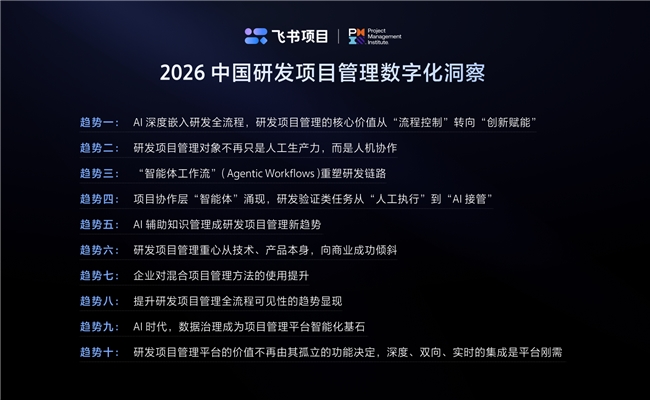 3月20日,飞书项目联合项目管理协会 PMI (中国)正式发布《2026 中国研发项目管理数字化洞察》报告(下称《洞察》)。该报告基于对数百位一线研发管理者的深度调研与实战洞察,系统梳理了AI时代下研发管理的十大关键趋势。
