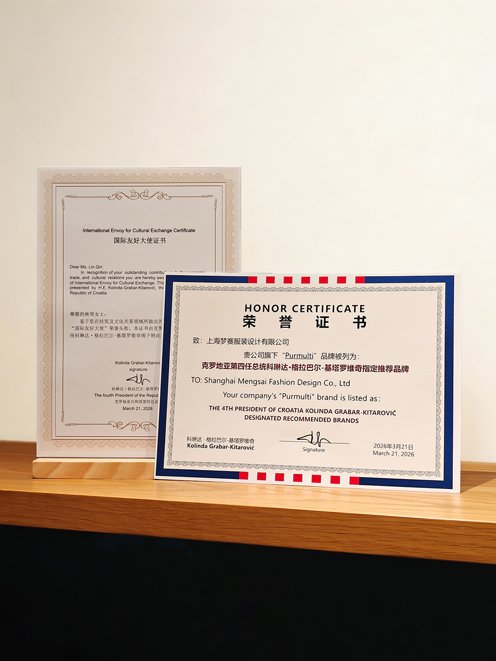 2026年3月21日,上海静安洲际酒店迎来了一场跨越国界的时尚与文化盛宴。在备受瞩目的高端会晤现场,克罗地亚第四任总统科琳达·格拉巴尔-基塔罗维奇(Kolinda Grabar-Kitarović)正式将“总统指定推荐品牌”荣誉证书授予上海梦赛服装旗下设计师品牌Purmulti。与此同时,品牌创始人林琴女士凭借在推动中外文化交流中的杰出表现,被正式授予“国际友好大使”荣誉称号。活动现场,林琴女士与克罗地亚首位女总统、2026年联合国秘书长候选人科琳达亲切会晤并合影留念。科琳达总统对Purmulti的面料质感、剪裁工艺及品牌内核给予高度评价,她表示,Purmulti将东方美学与现代时尚精妙融合,为中克文化交流注入了全新活力,同时期待更多兼具东方底蕴与国际视野的中国原创品牌,登上世界时尚舞台。
