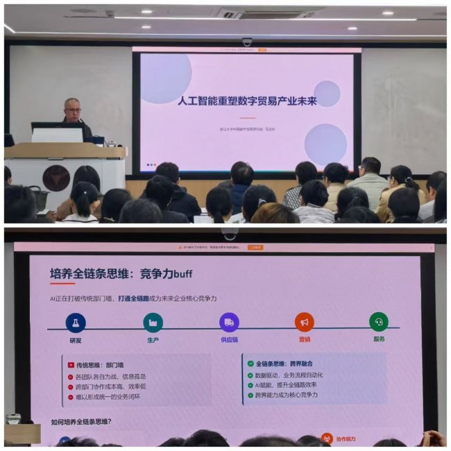3月21日上午,第一期高校教师数字贸易研修班在浙江大学经济学院203教室举行。浙江大学中国数字贸易研究院院长、长江学者马述忠教授以“人工智能重塑数字贸易产业未来”为题作主旨报告,深度解析AI技术对数字贸易产业的变革与引领作用。