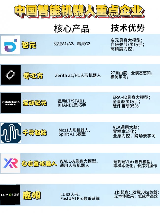 在头部阵营中,银河通用、千寻智能、智平方等企业手握百亿估值,成为赛道核心标杆 —— 银河通用凭借全栈技术拿下宁德时代、博世等巨头数千台订单,智慧零售场景落地超百家;千寻智能自研具身大模型与力控系统,在新能源制造产线实现零故障量产;智平方突破一体化决策技术,拿下全球最大单一采购订单。宇树科技、松延动力则成为大众消费市场的开拓者,前者借春晚出圈实现技术普及,量产能力位居行业第一梯队;后者以轻量化、低成本路线推动人形机器人走进大众场景,完成多轮融资成为赛道新锐。