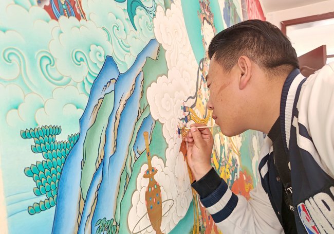 年轻的画师在绘制唐卡。蔡得军摄