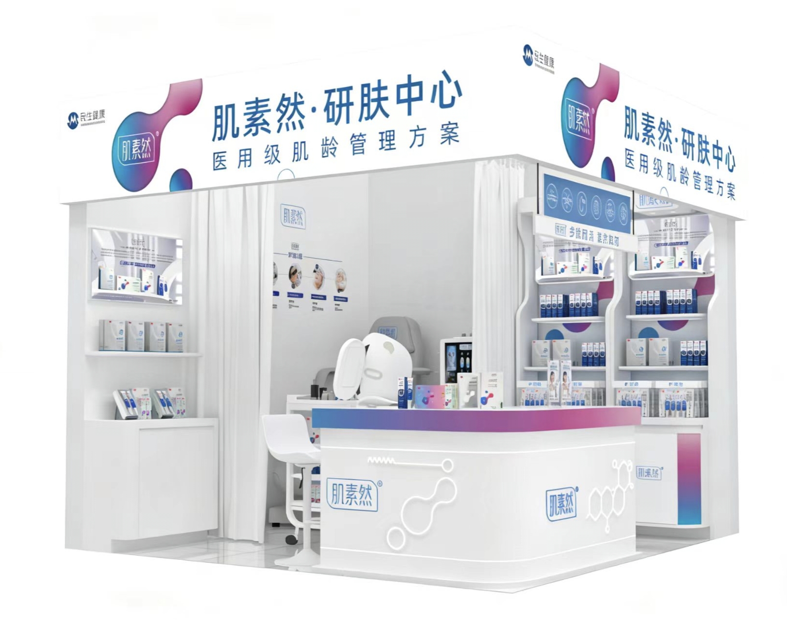 肌素然协助连锁客户优选核心门店,搭建吸睛醒目的“肌素然·研肤中心”服务场地,以专业化的空间设计和可视化的医学级形象,高效吸引客流、精准对接目标客群。店中店不仅是产品展示与销售的场所,更是专业服务的交付中心,通过“产品体验+专业护理”的深度融合,帮助核心门店快速建立医学级抗衰的专业壁垒,实现客单价与复购率的双重提升。