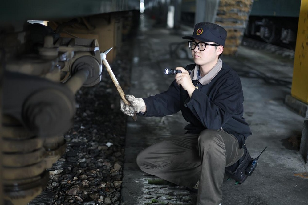 客车检车员在进行车侧巡检(叶琳艳 摄)
